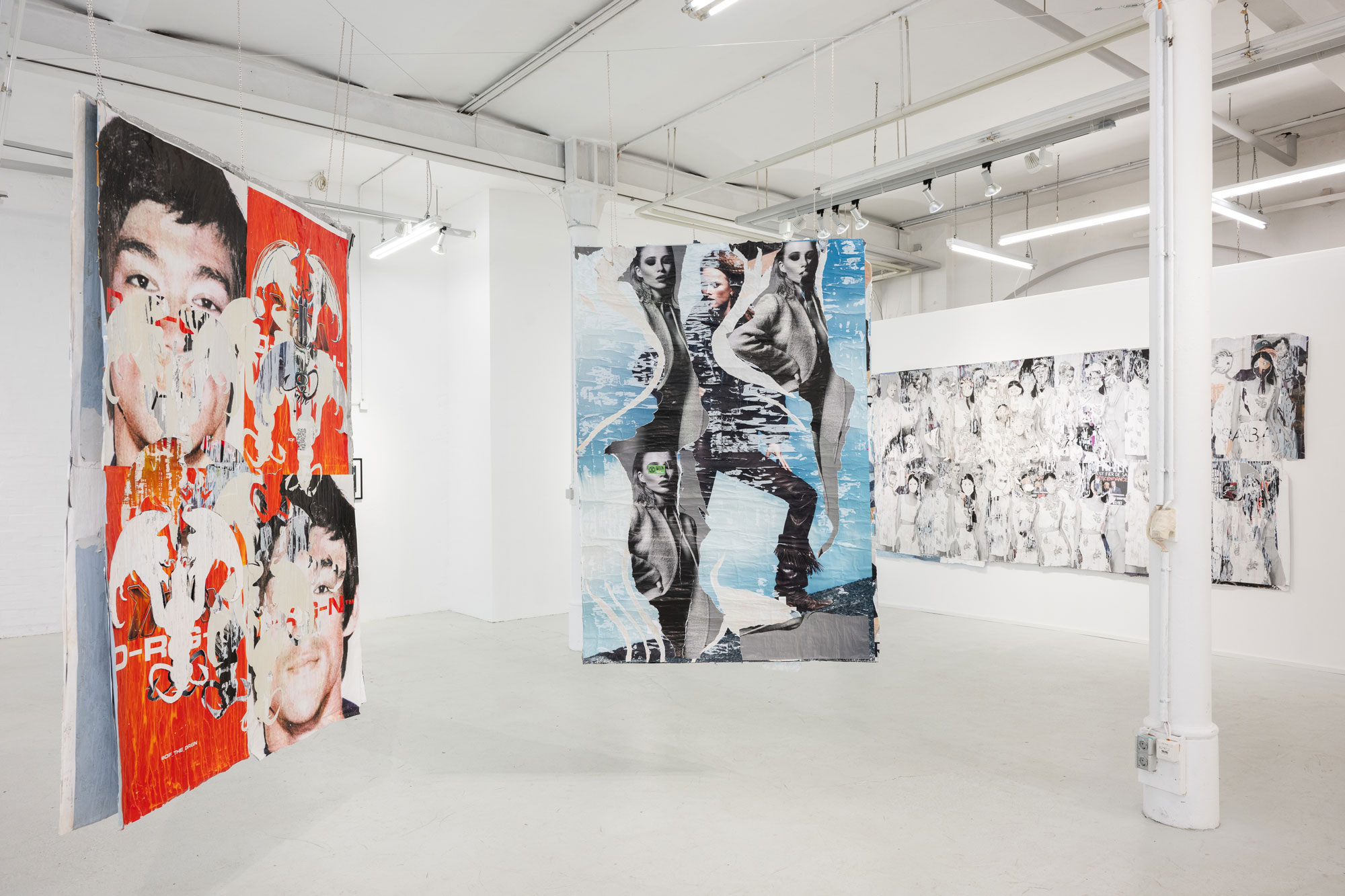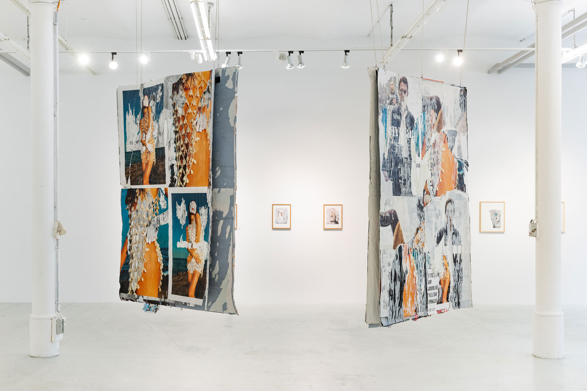 Engl: In Marais, Paris, with its vibrant LGBTQIA+ community, historical charm and Jewish heritage, I was able to expand the scope of my materials in 2024 with an artist-in-residence grant from the Ministry of Science, Research and the Arts at the Cité Internationale des Arts. In the tradition of the Affichistes, I took down illegally pasted, multi-layered advertising posters, which were put up on the walls of buildings during Fashion Week, among other things, and used them as a starting point for skinning with a cutter knife and sandpaper. The title of many of my works, "Häutungen", refers to the feminist classic by Verena Stefan, among others.