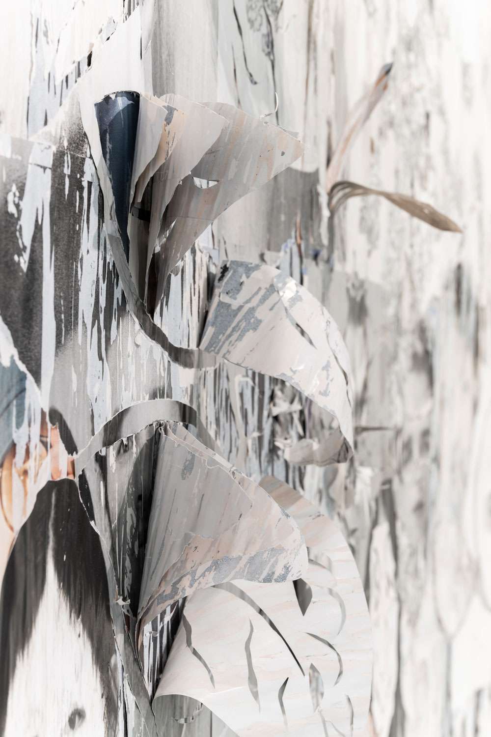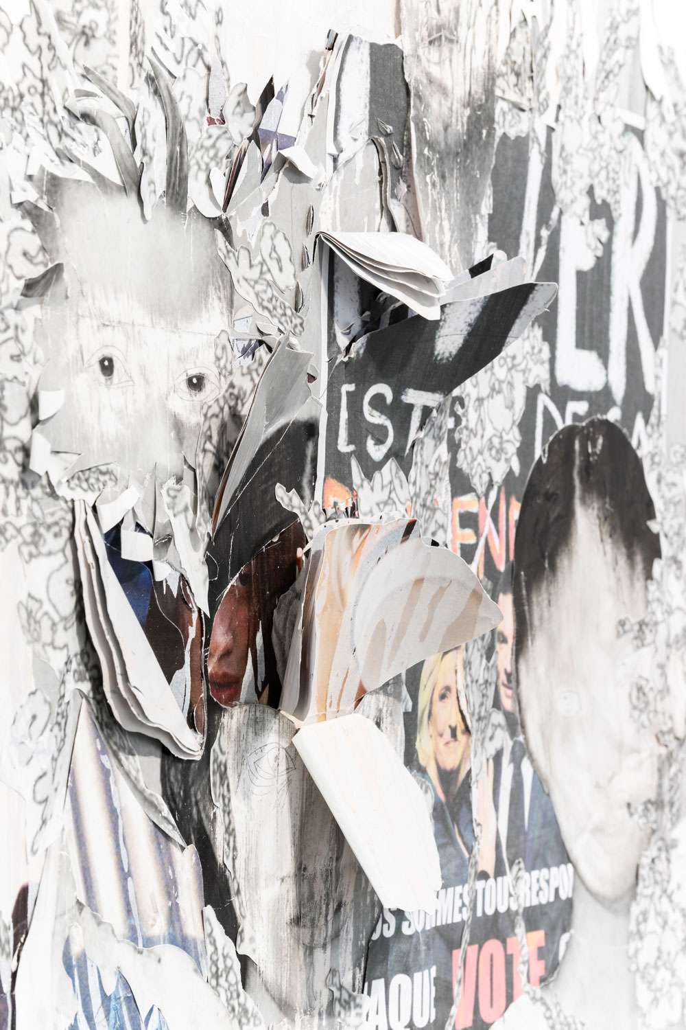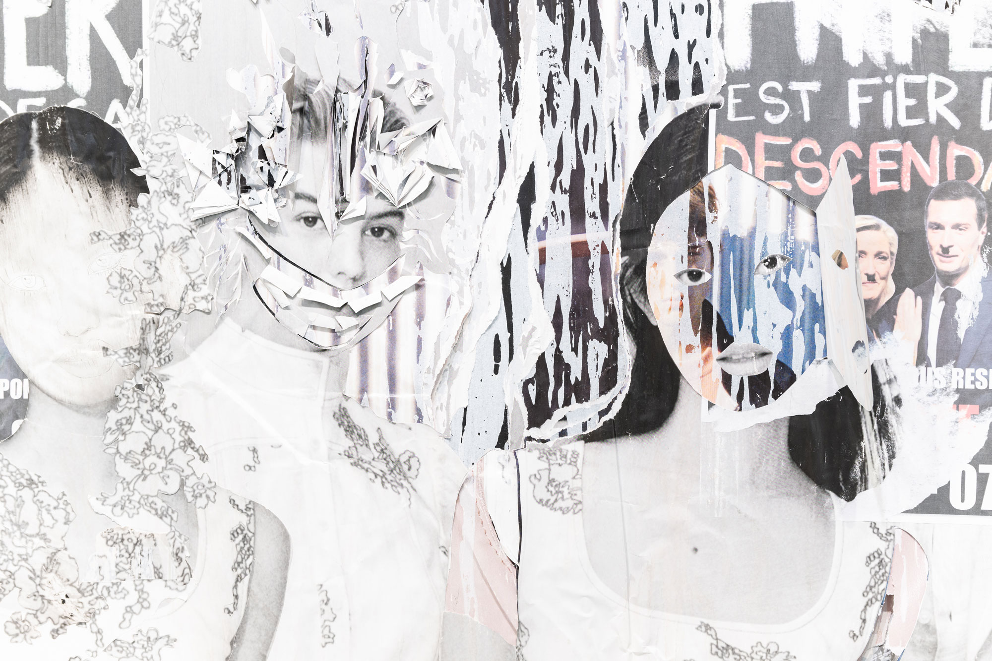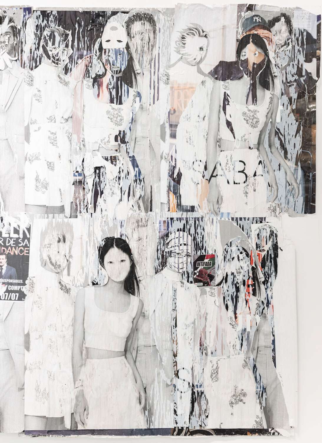 Décollage including collage elements - Nine-layered poster partially removed with a cutter knife and sanding sponge